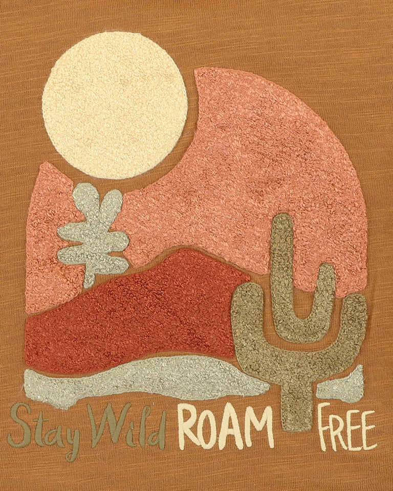 Get ready for summer adventures with the Abstract Oasis Cactus Tee. This playful tee features a textured desert appliqué and "Stay Wild Roam Free" embroidery in earthy tones, perfect for little explorers. Made from soft 100% cotton jersey, it’s comfy and easy to wear with a convenient press stud shoulder opening. Pair it with the matching gingerbread shorts for a fun, coordinated outfit that siblings will love too!