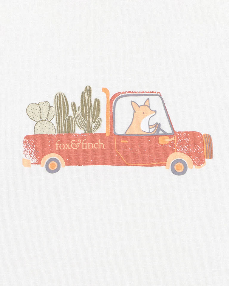 Get your little adventurer ready for sunny days with the Abstract Oasis Ute Bodysuit! Made from soft cotton elastane jersey, it offers comfy stretch for all-day fun. The playful fox and cactus truck print brings a touch of cheeky charm, while short sleeves keep things cool. Easy to dress with press stud shoulder openings and quick snap crotch closures, this bodysuit pairs perfectly with denim shorts for a laid-back summer vibe.