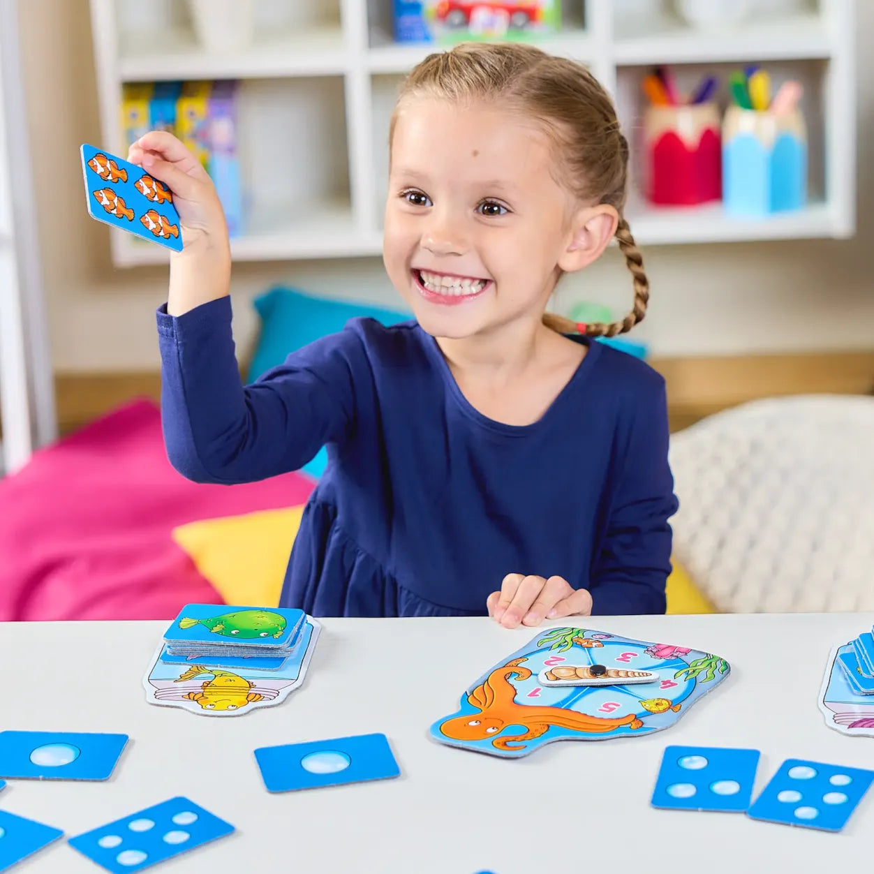 Dive into fun with Catch and Count! Spin the octopus spinner, count the bubbles, and collect matching fish cards on your board. But beware the shark card—it can gobble up your catch and send you back to start! With colorful sea creatures like clownfish, starfish, crabs, and pufferfish, this game combines counting practice with exciting surprises. Perfect for little explorers eager to learn and play under the sea!