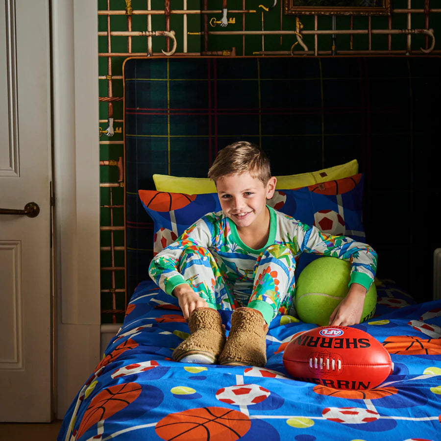 Let your little one embark on a dino adventure with the Dino Safari Organic Cotton Long Sleeve Pyjama Set! Made from 100% organic cotton jersey, this cozy set features a relaxed fit top and matching pants for ultimate comfort. Bright rainbow-coloured dinosaurs like T-Rex, Stegosaurus, Triceratops, and Pterosaur roam across crisp white fabric, accented with green cuffs. Perfect for lounging or dreaming big, these PJs create a joyful, snug retreat for your little explorer at home.