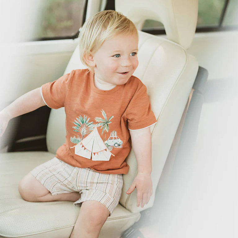 Inspired by sun-drenched camping adventures and family road trips, this clay-toned tee brings storybook magic to everyday dressing. The vintage-style tent print features playful flaps that lift to reveal a hidden illustration-adding a touch of fun to every wear. Ideal for park playdates or relaxed summer days, this tee pairs effortlessly with the Boys stripe shorts or Boys sage green shorts for a complete outfit.