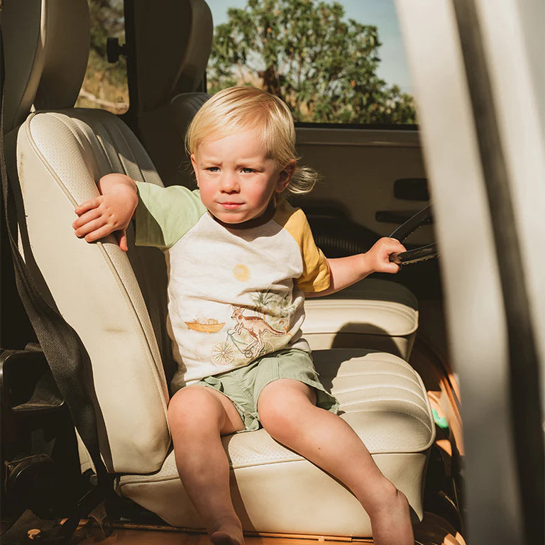 Let your little adventurer set off in style with the Ivan Cycling Kangaroo Tee. Featuring a charming 3D kangaroo appliqué riding a vintage-style bike through the bush, this tee adds a playful touch to everyday fun. Made from soft cotton elastane, it offers comfy stretch and vibrant contrast raglan sleeves in yellow and sage. Finished with a rust rib neck trim, it’s perfect for summer days. Available in baby sizes too, so siblings can match effortlessly. Pair it with our Boys Sage Green Shorts for an easy, cool look.