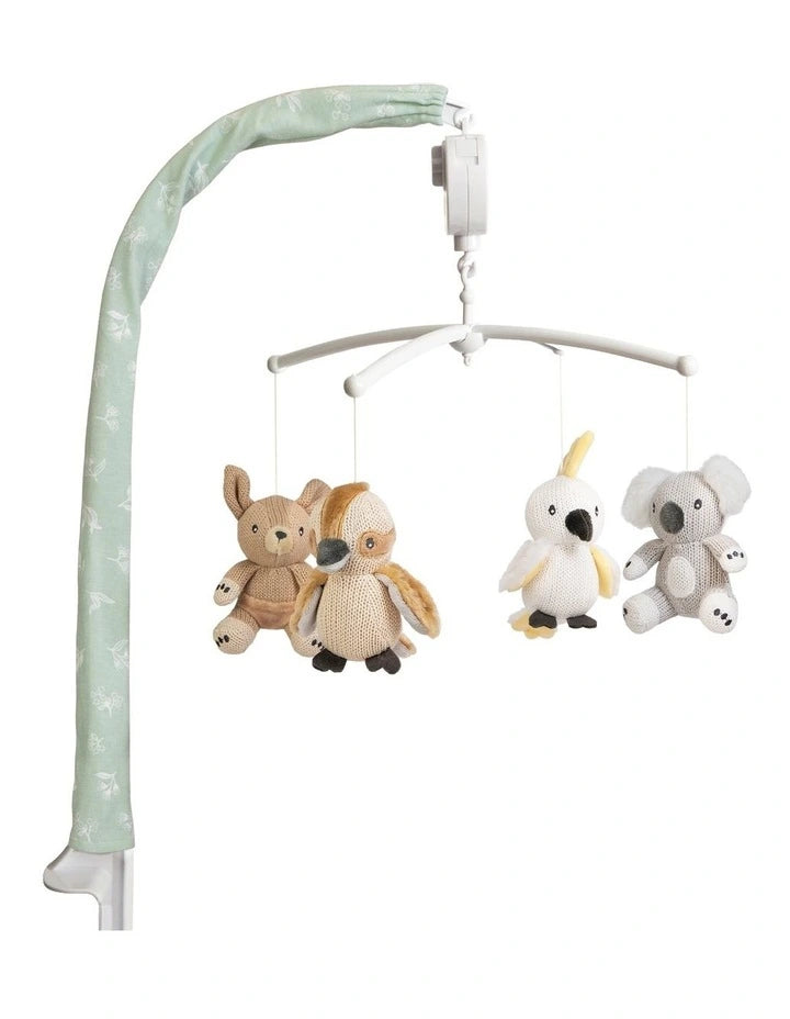 Introduce your little one to the magic of Australian wildlife with this enchanting musical mobile. Featuring adorable native animals that gently twirl overhead, it plays the timeless lullaby 'Wiegenlied' by Johannes Brahms—the perfect soundtrack for peaceful slumber. Crafted with exquisite detail and soft cotton knit materials, this cot mobile is designed for newborns through 5 months and comes complete with all mounting hardware. Safety-tested to Australian and New Zealand standards, it's the ideal way to transform your nursery into a serene, nature-inspired sanctuary. Pair it with our other Australiana essentials to complete the dreamy look your little one will treasure.