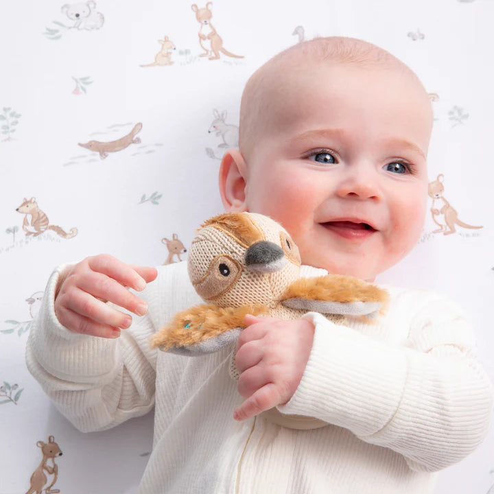 Soothe and entertain your little one with our charming Kookaburra Rattle! Made from soft cotton knit and a BPA-free silicone teether ring, this rattle is perfect for tiny hands and growing gums. Plus, it's tested to AUS/NZ toy standards for safety. Get a matching stroller ring attachment for even more fun!