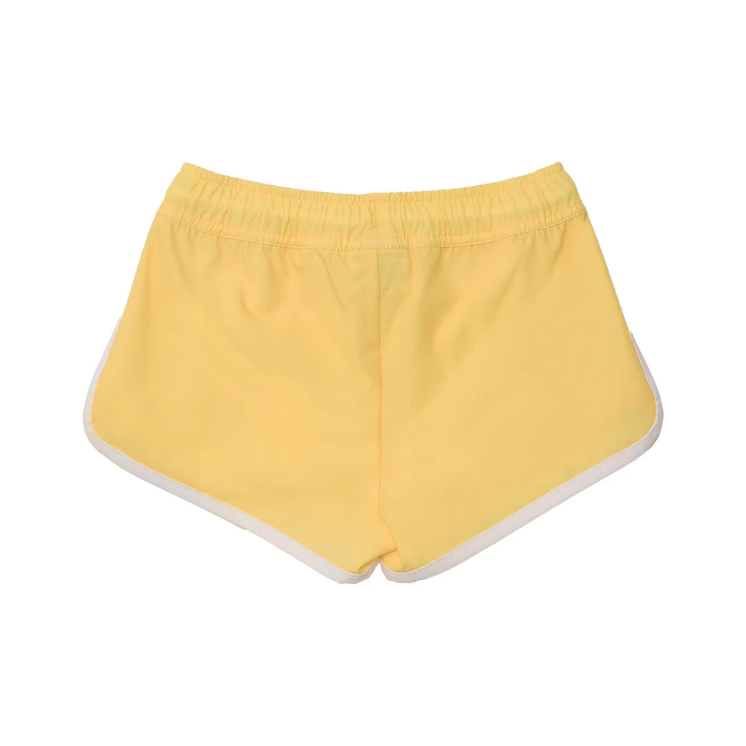 Perfect for active girls, the Surf Short - Buttercup offers comfy coverage for beach, pool, or everyday fun. Made from certified recycled yarn with 4-way stretch, it moves with your little one while providing UPF 50+ sun protection. Its quick-dry, waterproof finish prevents cling, and the elasticated waist with drawstring ensures a snug, adjustable fit. Mini short style, high chlorine resistance, and no harmful chemicals make it an ideal, playful choice designed in New Zealand for ages 1 to 10 years. Pair with a Crywolf Rash Vest for full sun-safe fun.