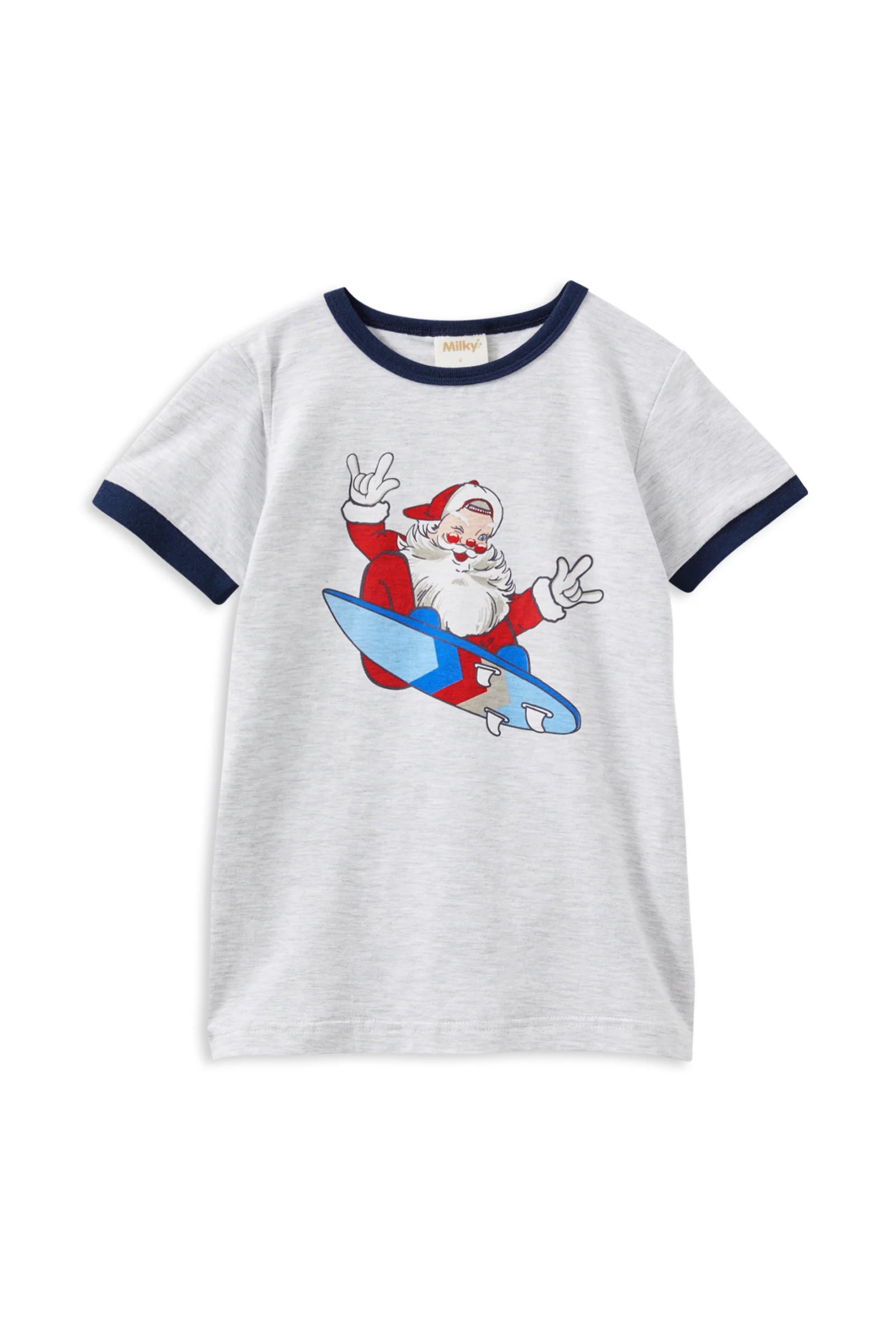 Surfing Santa Tee Ho ho whoa! This cheeky Surfing Santa Tee brings holiday hilarity to life with a skateboarding Santa graphic that's guaranteed to raise smiles. Set against a cool silver marle base with navy ribbing at the neckline and sleeves, it's the perfect blend of festive fun and laid-back cool. Crafted for comfort, this tee lets your little one spread Christmas cheer with a twist—because who says Santa can't catch some gnarly waves? A standout piece that'll have everyone talking this holiday season!