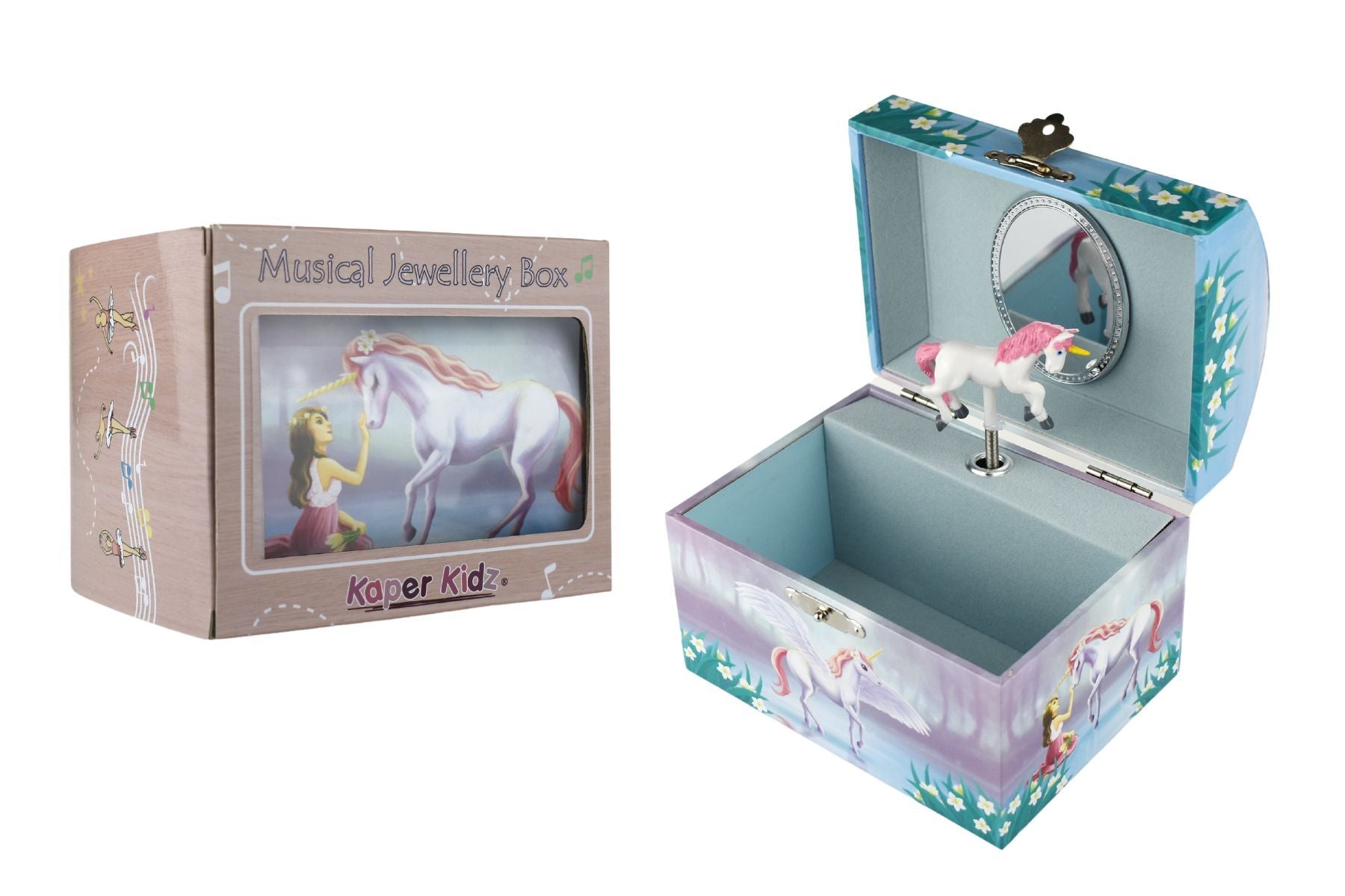 Delight your little ones with the Unicorn Dome Music Box from Kaper Kidz. Watch their smiles grow as they wind the handle, open the lid, and see the unicorn twirl to the gentle music inside. With charming illustrations of dancers and ballerinas, this keepsake brightens any shelf or table. Inside, a soft velvet lining cushions treasures, while a mirror behind the spinning unicorn adds an enchanting touch. Magical, playful, and perfect for storing precious memories.